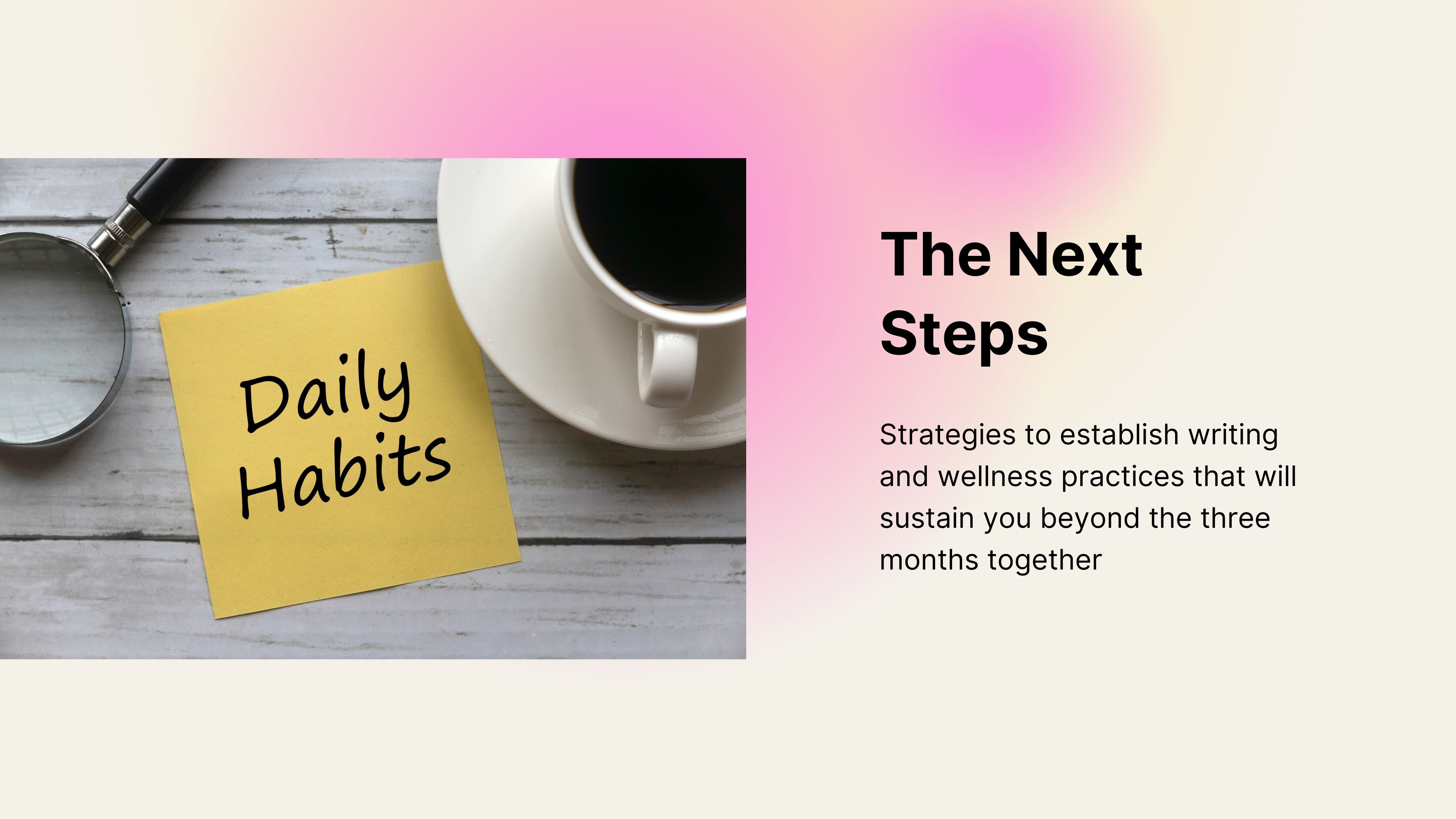 By the time we finish our eight weeks, you will have a better understanding of how you want to cultivate your writer identity, neutralize your inner critic, create strategies for navigating your stuck places, and develop habits of writing that will keep you on track for what you want to accomplish while maintaining workalike balance and disrupting toxic productivity culture to prevent burnout and fatigue.