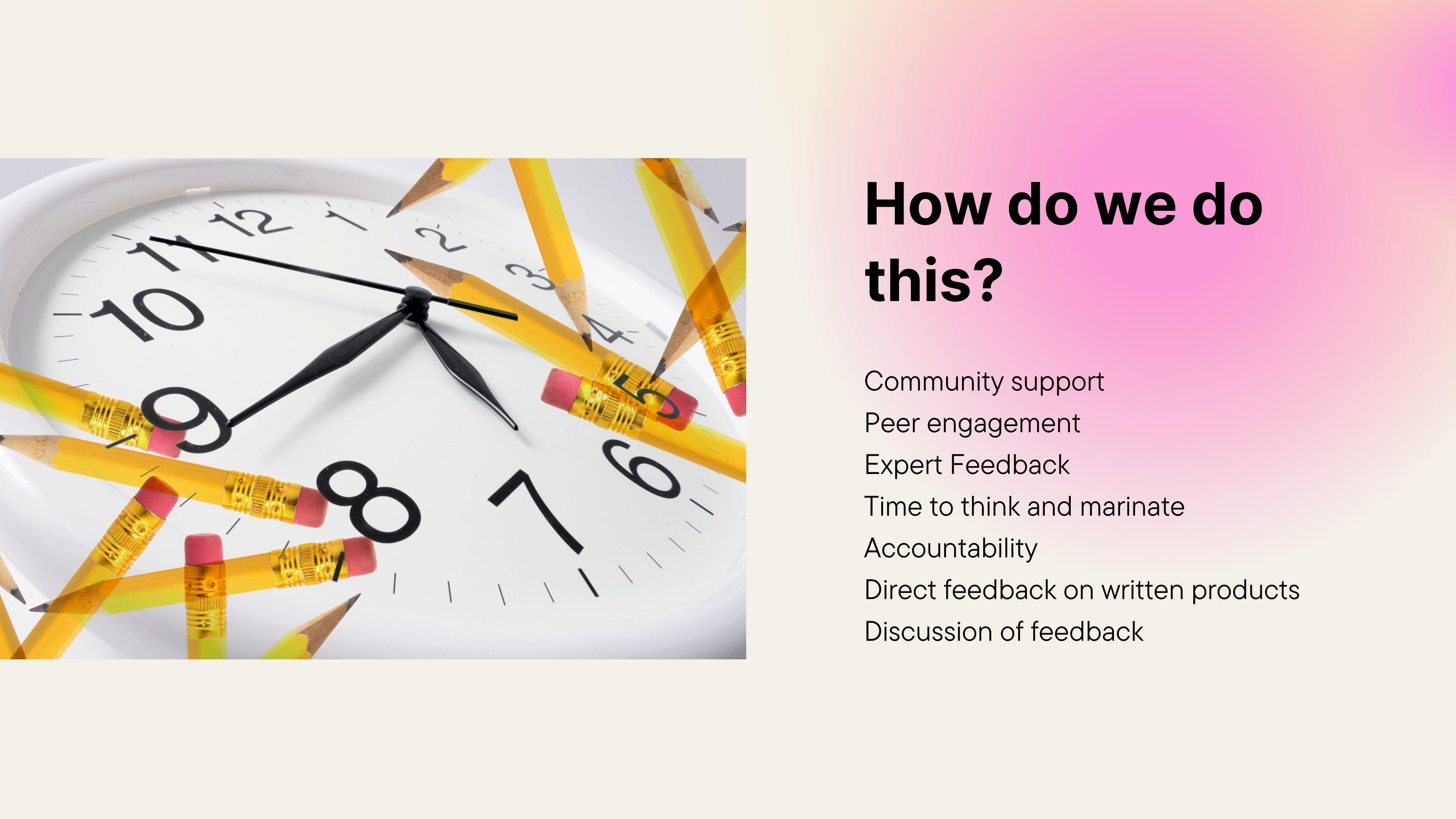 Join us for an enriching journey of professional growth in our weekly 2-hour synchronous meetings, scheduled as mentioned on this page. These sessions are a blend of insightful feedback on your submitted writing and dynamic workshops tailored to your professional development needs. Every alternate week, you'll experience customized professional development workshop focusing on a new skill to elevate your writing prowess. In the intervening weeks, you'll receive live in-depth, personalized feedback on your work. This balanced approach ensures continuous learning and improvement, making each session an invaluable step in honing your writing craft.